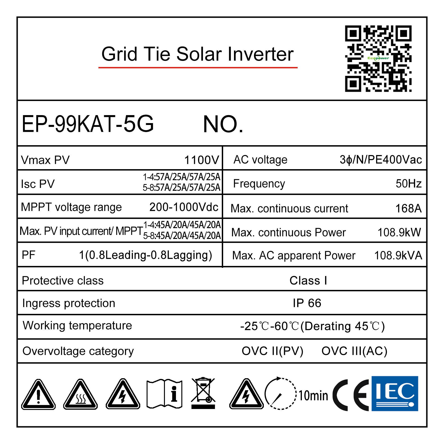 Ecopower EP-99KAT-5G là inverter hòa lưới 3 pha công suất danh định 99kW, phù hợp cho hệ thống điện mặt trời áp mái nhà xưởng, trung tâm thương mại, kho bãi và các công trình công nghiệp quy mô lớn. Thiết bị có điện áp PV tối đa 1100V, dải MPPT 200–1000VDC, công suất AC tối đa 108.9kW / 108.9kVA và chuẩn bảo vệ IP66, giúp vận hành ổn định và bền bỉ trong môi trường ngoài trời.